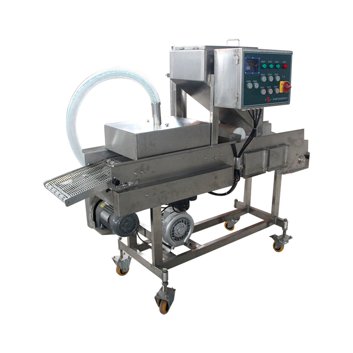 上屑機與上漿機配合使用,裹面包屑機可單獨使用。上面包屑機適合于中等以上干面包糠顆粒,全自動裹康機對市場上流行的漢堡肉餅、麥樂雞塊、魚香漢堡肉餅、土豆餅、南瓜餅、肉串等產品進行上面包屑處理,是快餐店、配送中心、食品工廠理想的上面包屑設備。