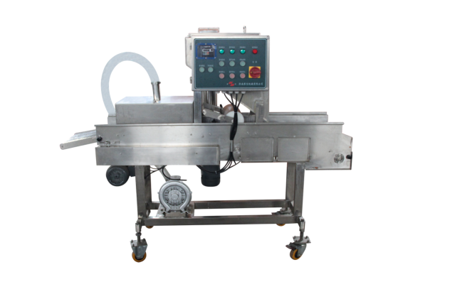 上屑機與上漿機配合使用,裹面包屑機可單獨使用。上面包屑機適合于中等以上干面包糠顆粒,全自動裹康機對市場上流行的漢堡肉餅、麥樂雞塊、魚香漢堡肉餅、土豆餅、南瓜餅、肉串等產品進行上面包屑處理,是快餐店、配送中心、食品工廠理想的上面包屑設備。